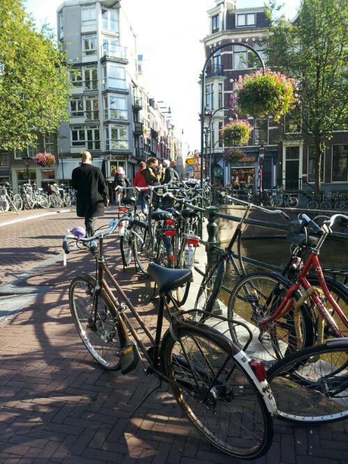 Bicycles absolutely, one hundred percent, run the streets in Amsterdam. It could potentially be hazardous for a pedestrian if you’re not paying attention. Walking around at any given time, you’re sharing the streets with trams, mopeds, cars, and thousands of bikes. We’ve also seen scooters, horses and carriages, and one chic on rollerblades. You’re supposed to be paying attention, but it’s hard when there’s just SO MUCH going on around you. When you’re on foot, you’re basically at the bottom of the right-of-way chain of command. You get yourself on a bike…BAM! Straight to the top, ruling the streets of Amsterdam. (We didn’t rent bikes while we were here. Last time Jess was on a bike, she ended up with eight stitches. It’s still a touchy subject.)